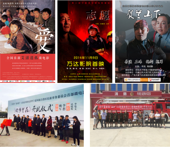 2014年拍攝了檢察院的《賀蘭山下》《黃河兒女》,消防總隊(duì)的《橙色閃耀寧夏川》《志愿》《石嘴山消防小蘋果》等,《志愿》作為第二屆寧夏消防微電影展映2014年11月7日在銀川西夏萬(wàn)達(dá)影院舉行首映,并在全區(qū)影院展映一個(gè)月。2015年5月11號(hào)由銀川市委宣傳部、共青團(tuán)銀川市委、銀川日?qǐng)?bào)、銀川晚報(bào)聯(lián)合舉辦的首屆“向上向善金河杯首屆微電影大賽”《志愿》榮獲全場(chǎng)一等獎(jiǎng),《賀蘭山下》榮獲二等獎(jiǎng),另《賀蘭山下》榮獲全國(guó)檢察系統(tǒng)防職務(wù)犯罪微電影優(yōu)秀作品獎(jiǎng)?!洞鷥r(jià)》反應(yīng)了一些違法份子通過(guò)制作及銷售假發(fā)票牟利,經(jīng)過(guò)地稅稽查局及公安的努力最終抓捕犯罪份子。與自治區(qū)民委合作拍攝了反應(yīng)回漢一家親親情感人民族題材作品《蘭香吳忠》。寧夏紀(jì)檢監(jiān)察系統(tǒng)首部廉政微電影《一家之主》推進(jìn)了黨風(fēng)廉政建設(shè)、加強(qiáng)和改進(jìn)廉政警示教育工作的新嘗試,做到以小見(jiàn)大,以影教人,以影化人的警示教育作用。首部艾滋遺孤公益微電影《愛(ài)》,講述是的患有艾滋病的患者因得不到及時(shí)有效的治療離開人世,自己的孩子變成孤兒,被身邊人孤立、嫌棄的真實(shí)故事。從一個(gè)艾滋遺孤的生活歷程,講述了一個(gè)讓人心痛,值得人深思的故事。希望喚醒人們的良知,去關(guān)注艾滋病患者,幫助艾滋病患者。公益微電影《紅手絹》講述小男孩走出大山來(lái)到城市里上大學(xué),但是“紅手絹”卻是男孩心中唯一放不下的,當(dāng)男孩回到大山里卻發(fā)現(xiàn)一直牽掛的“紅手絹”不在了……