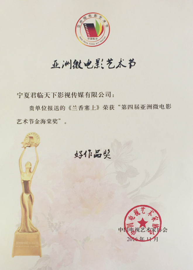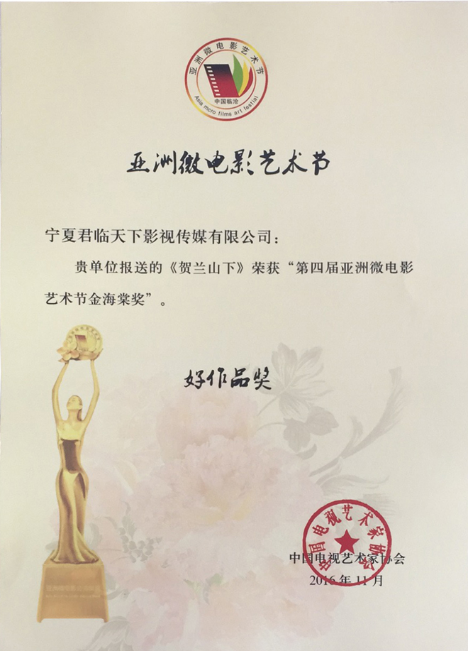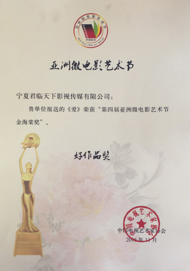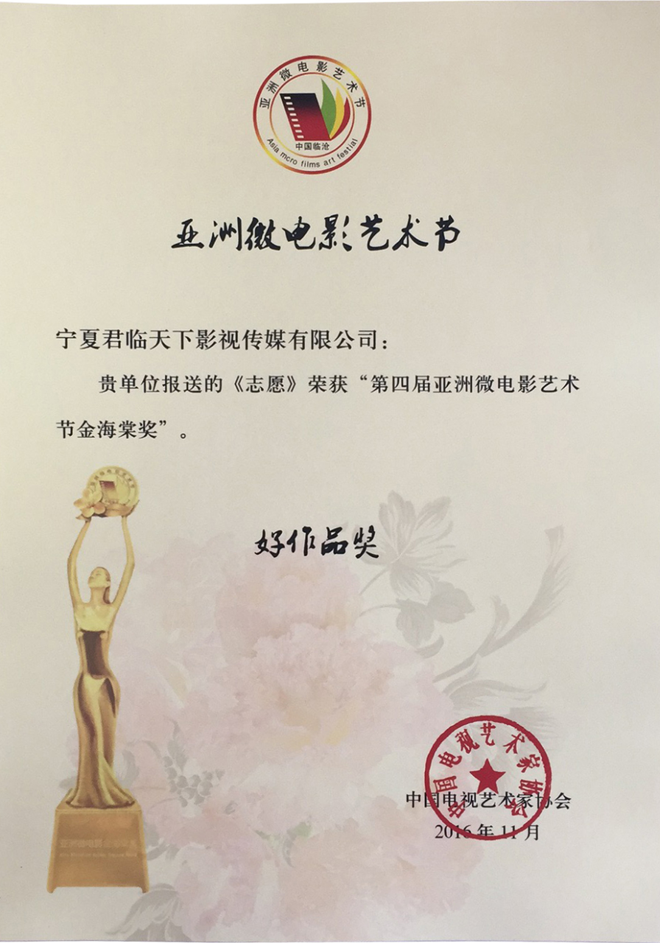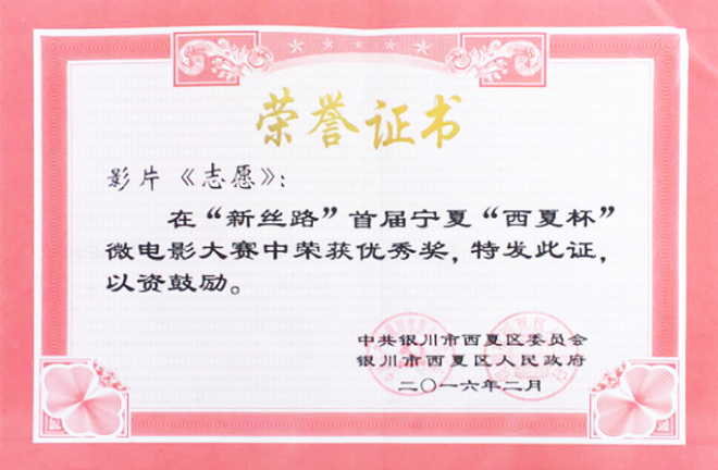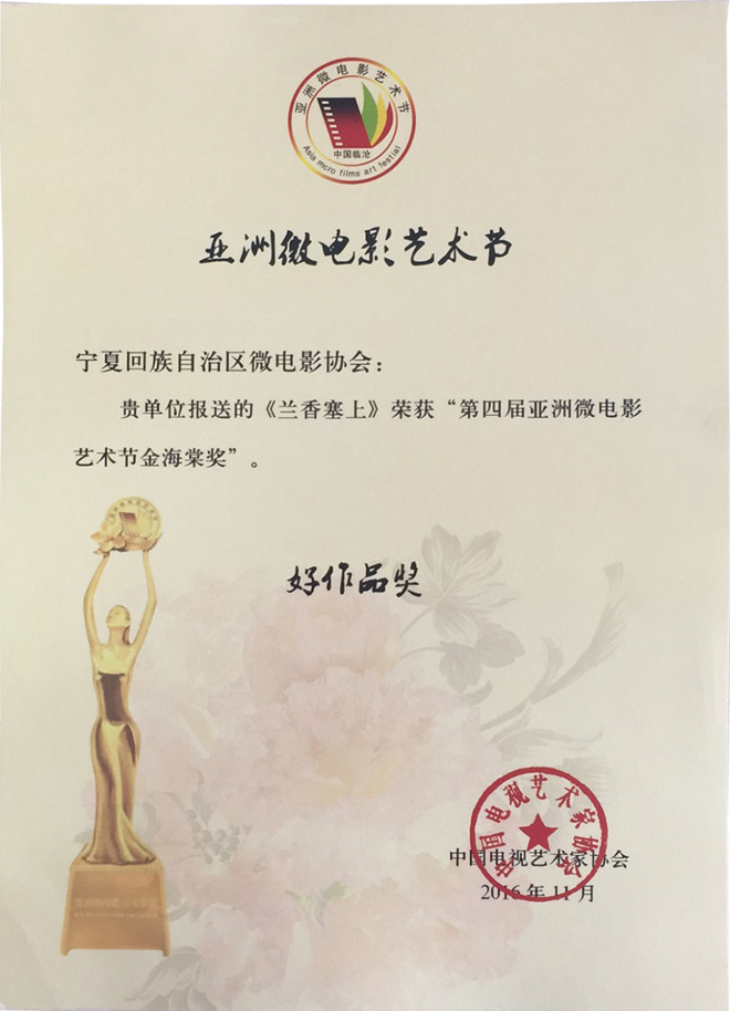2016年第四屆亞洲國(guó)際微電影藝術(shù)節(jié),寧夏微電影協(xié)會(huì)出品的影片《愛(ài)》榮獲亞洲微電影金海棠“優(yōu)秀公益獎(jiǎng)”、“優(yōu)秀紀(jì)實(shí)獎(jiǎng)”,《蘭香塞上》榮獲亞洲微電影金海棠“優(yōu)秀攝影獎(jiǎng)”和中國(guó)金風(fēng)箏國(guó)際微電影獎(jiǎng)“優(yōu)秀作品獎(jiǎng)”、《賀蘭山下》《紅手絹》《志愿》榮獲亞洲微電影金海棠“好作品獎(jiǎng);寧夏微電影協(xié)會(huì)主席魏軍榮獲“十佳制片獎(jiǎng)”。其中寧夏回族自治區(qū)民族事務(wù)委員會(huì)與寧夏微電影協(xié)會(huì)聯(lián)合出品的影片《蘭香塞上》榮獲亞洲微電影金海棠“優(yōu)秀攝影獎(jiǎng)”、“好作品獎(jiǎng)”,寧夏微電影協(xié)會(huì)與香港智行基金會(huì)聯(lián)合出品影片《愛(ài)》榮獲亞洲微電影金海棠“最佳公益獎(jiǎng)”、“最佳紀(jì)實(shí)獎(jiǎng)”、“好作品獎(jiǎng)”,寧夏公安消防總隊(duì)與寧夏微電影協(xié)會(huì)聯(lián)合出品的《志愿》榮獲亞洲微電影金海棠“好作品獎(jiǎng)”,石嘴山大武口區(qū)檢察院與寧夏君臨天下影視傳媒有限公司聯(lián)合出品的《賀蘭山下》榮獲亞洲微電影金海棠“好作品獎(jiǎng)”、榮獲“金河杯”“向上向善 最美銀川”首屆微視大賽微電影三等獎(jiǎng),寧夏微電影協(xié)會(huì)與銀川新聞網(wǎng)聯(lián)合出品的影片《紅手絹》榮獲亞洲微電影金海棠“好作品獎(jiǎng)”。