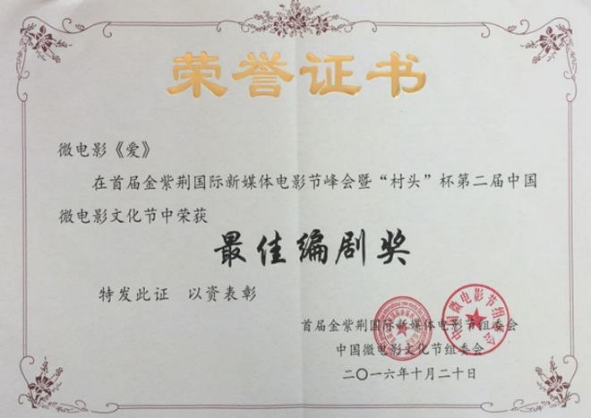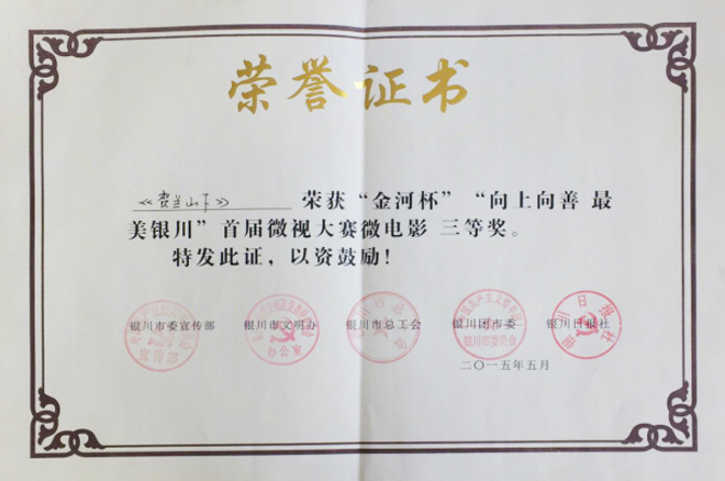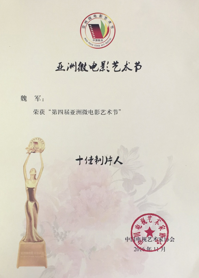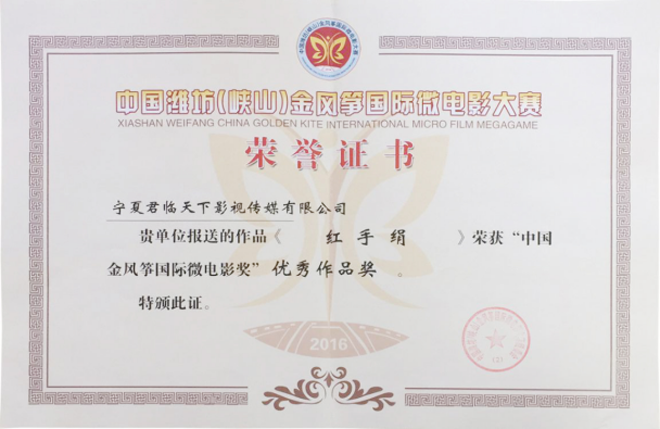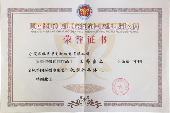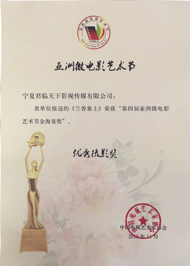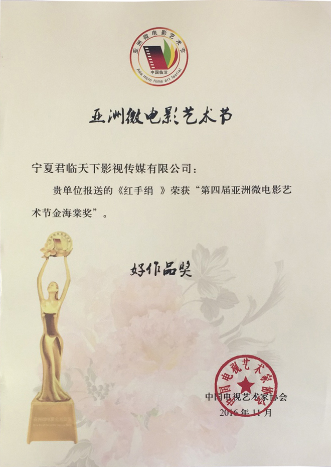 2016年第四屆亞洲國(guó)際微電影藝術(shù)節(jié),寧夏微電影協(xié)會(huì)出品的影片《愛(ài)》榮獲亞洲微電影金海棠“優(yōu)秀公益獎(jiǎng)”、“優(yōu)秀紀(jì)實(shí)獎(jiǎng)”,《蘭香塞上》榮獲亞洲微電影金海棠“優(yōu)秀攝影獎(jiǎng)”和中國(guó)金風(fēng)箏國(guó)際微電影獎(jiǎng)“優(yōu)秀作品獎(jiǎng)”、《賀蘭山下》《紅手絹》《志愿》榮獲亞洲微電影金海棠“好作品獎(jiǎng);寧夏微電影協(xié)會(huì)主席魏軍榮獲“十佳制片獎(jiǎng)”。其中寧夏回族自治區(qū)民族事務(wù)委員會(huì)與寧夏微電影協(xié)會(huì)聯(lián)合出品的影片《蘭香塞上》榮獲亞洲微電影金海棠“優(yōu)秀攝影獎(jiǎng)”、“好作品獎(jiǎng)”,寧夏微電影協(xié)會(huì)與香港智行基金會(huì)聯(lián)合出品影片《愛(ài)》榮獲亞洲微電影金海棠“最佳公益獎(jiǎng)”、“最佳紀(jì)實(shí)獎(jiǎng)”、“好作品獎(jiǎng)”,寧夏公安消防總隊(duì)與寧夏微電影協(xié)會(huì)聯(lián)合出品的《志愿》榮獲亞洲微電影金海棠“好作品獎(jiǎng)”,石嘴山大武口區(qū)檢察院與寧夏君臨天下影視傳媒有限公司聯(lián)合出品的《賀蘭山下》榮獲亞洲微電影金海棠“好作品獎(jiǎng)”、榮獲“金河杯”“向上向善 最美銀川”首屆微視大賽微電影三等獎(jiǎng),寧夏微電影協(xié)會(huì)與銀川新聞網(wǎng)聯(lián)合出品的影片《紅手絹》榮獲亞洲微電影金海棠“好作品獎(jiǎng)”。