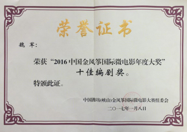 2016年 榮獲中國(guó)金風(fēng)箏國(guó)際微電影年度大獎(jiǎng)“最佳編劇獎(jiǎng)”。